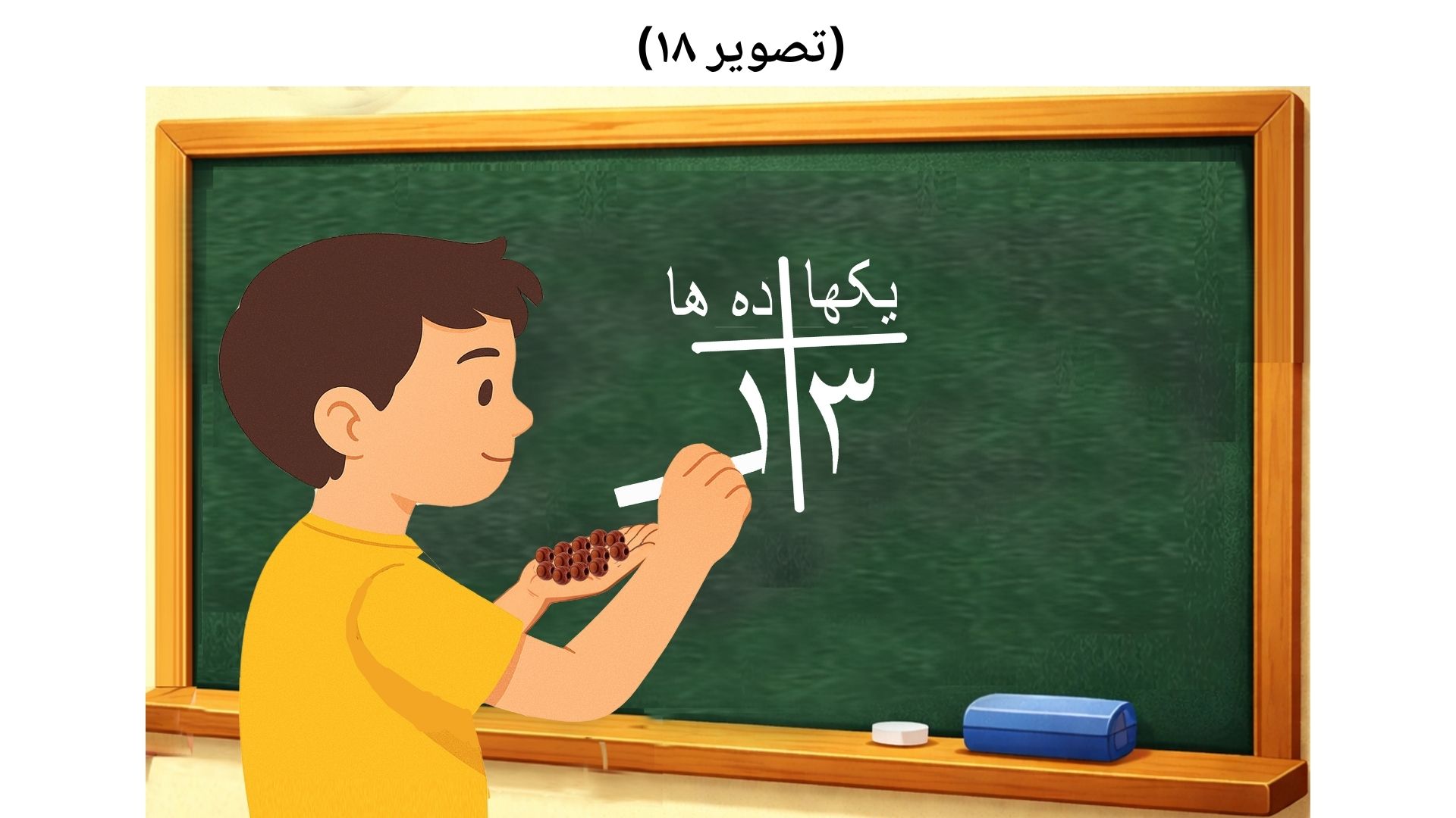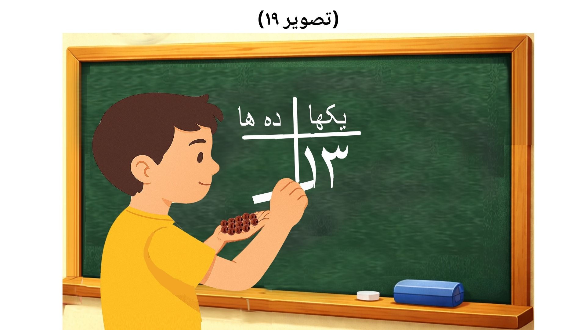 و اگر شاگرد مانند:(تصویر ۱۹)، ۱۳ را مکمل در یکها نوشت، آنگاه از شاگردان سوال میکنیم: شاگردان عزیز! کسی گفته میتواند که آیا میتوانیم در جدول ارزش مقامی ارقام، عدد ١٣ را در خانه مربوط یکها بنوسیم؟