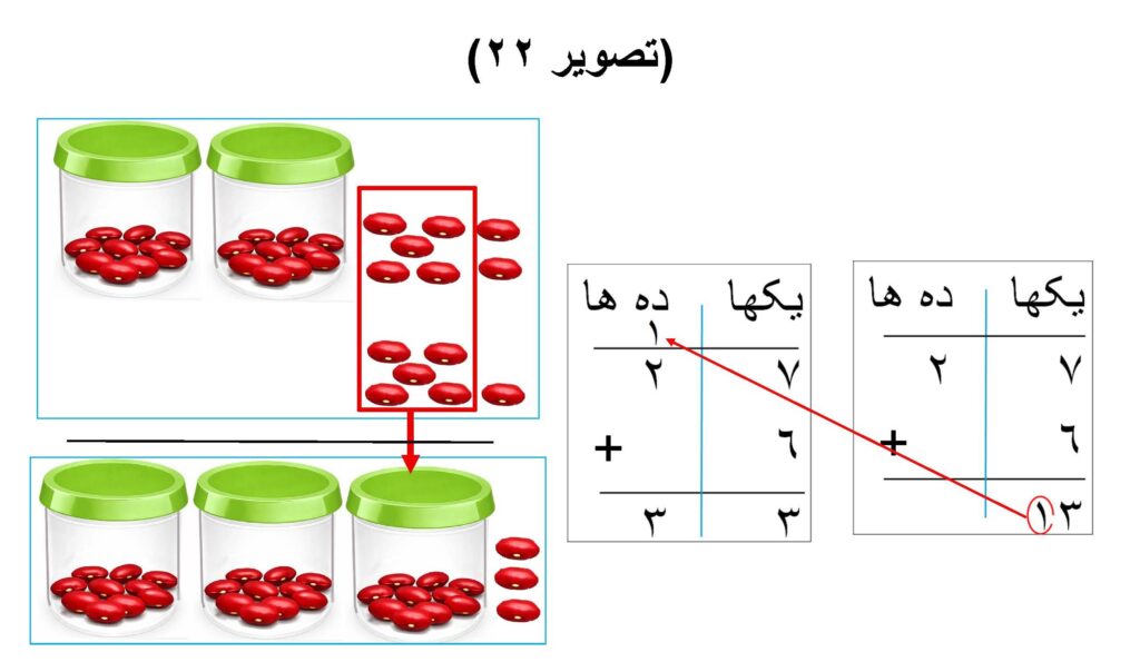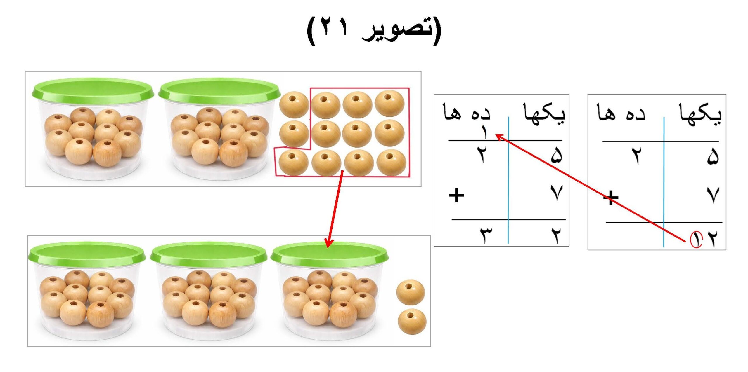 سپس مانند:(تصویر ۲۱)، یکها را با هم جمع میکنیم که میشود ۱۲ یکها، بعد دور ۱۰ یکها را حلقه کرده و آنرا به یک قوطی دیگر ریخته و یک دهها حاصل میشود، سپس همین یک دهها را با دو دههای قبلی جمع میکنیم که ۲ یکها و ۳ دهها میشود.