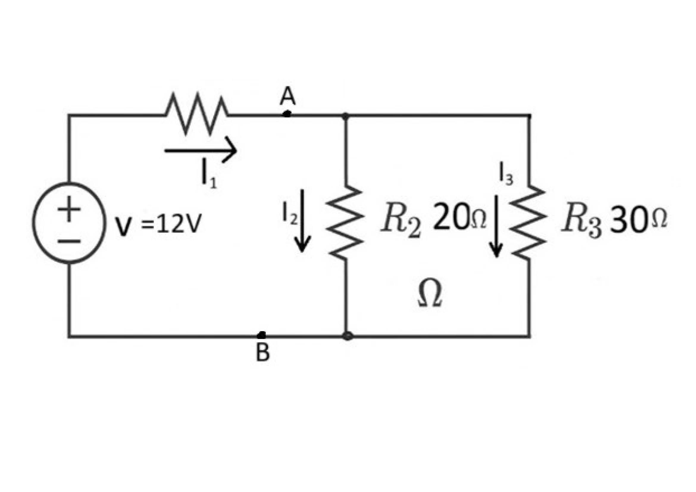 12V – I1×10Ω – I2×20Ω = 0