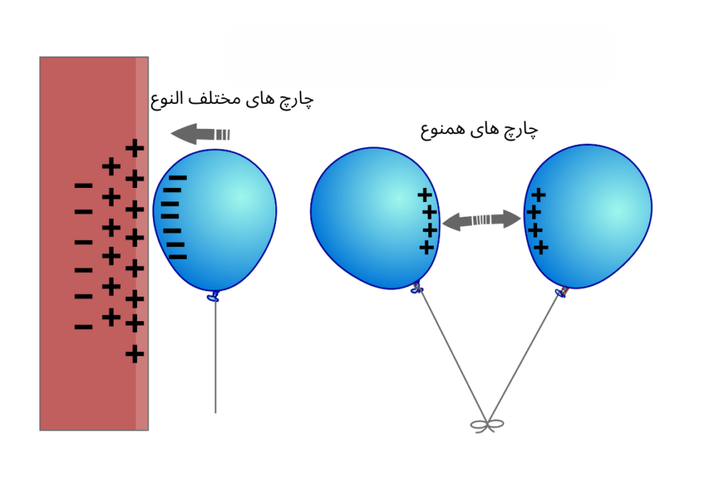 در شکل دیده می شود که چارچ های مثبت یکدیگر را دفع و چارچ های مثبت و منفی با قرار گرفتن در مقابل هم جذب می شوند.