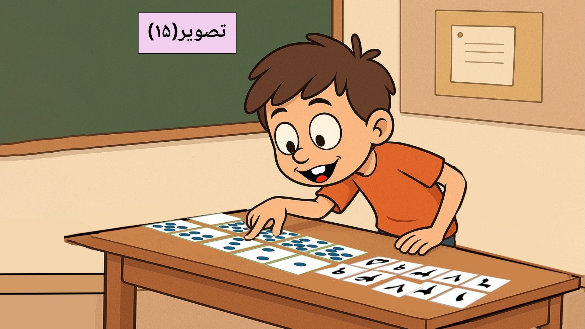 فعالیت آموزشی۲: کارتهای اعداد که روی آنها، اعداد به سمبول و شکل درج است را روی میز طور غیرمنظم گذاشته، و کار به شکل انفردای صورت میگیرد. طور مثال: از یک شاگرد میخواهیم که پیش تخته بیاید و یک عدد، مثلا: عدد ۳ را اول به سمبول و بعد به شکل از روی میز پیدا کند و شکل آن عدد را با توجه به مسیر نوشتن و تعداد حرکت در نوشتن آن، روی تخته بنویسد. مانند: (تصویر ۱۵).
