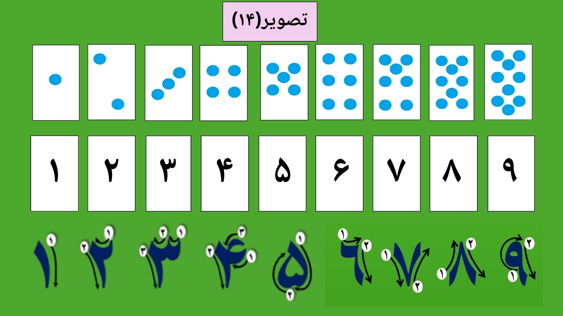 سپس شکل هر عدد را یکی یکی به شاگردان نشان داده و هر کدام را زیر تعداد مربوطه آن نصب کرده و بعد اعداد را یکی یکی نوشته اما مسیر حرکت برای نوشتن هر عدد را برای شاگردان روی تخته نشان میدهد. مانند: (تصویر ۱۴)