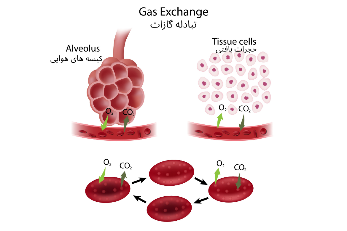کیسه های هوایی محل اصلی تبادله گازات است. هر کیسه هوایی دارای تعداد موی رگ ها است که آکسیجن وارد شده به کیسه های هوایی را جذب می کنند و کاربن دای اکساید را که از حجرات بدن گرفته اند به داخل کیسه های هوایی رها می نمایند. هر شش میلیون ها کیسه هوایی دارد، سطح عمومی کیسه های هوایی شش ها بیشتر از صد متر مربع است یعنی سطح عمومی آن ها تقریبا ۵۰ برابر پوست بدن انسان می باشد. از همین سبب است که اکسیجن را به اندازه کافی اخذ نموده کاربن دای اکساید را خارج کرده می تواند.