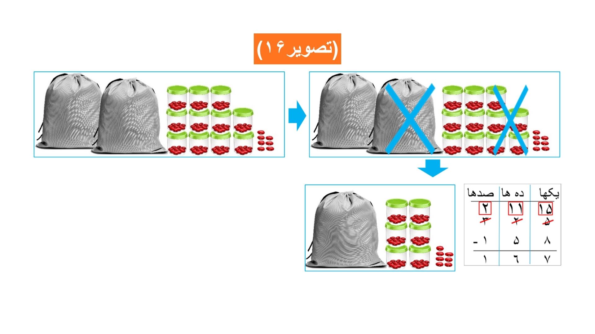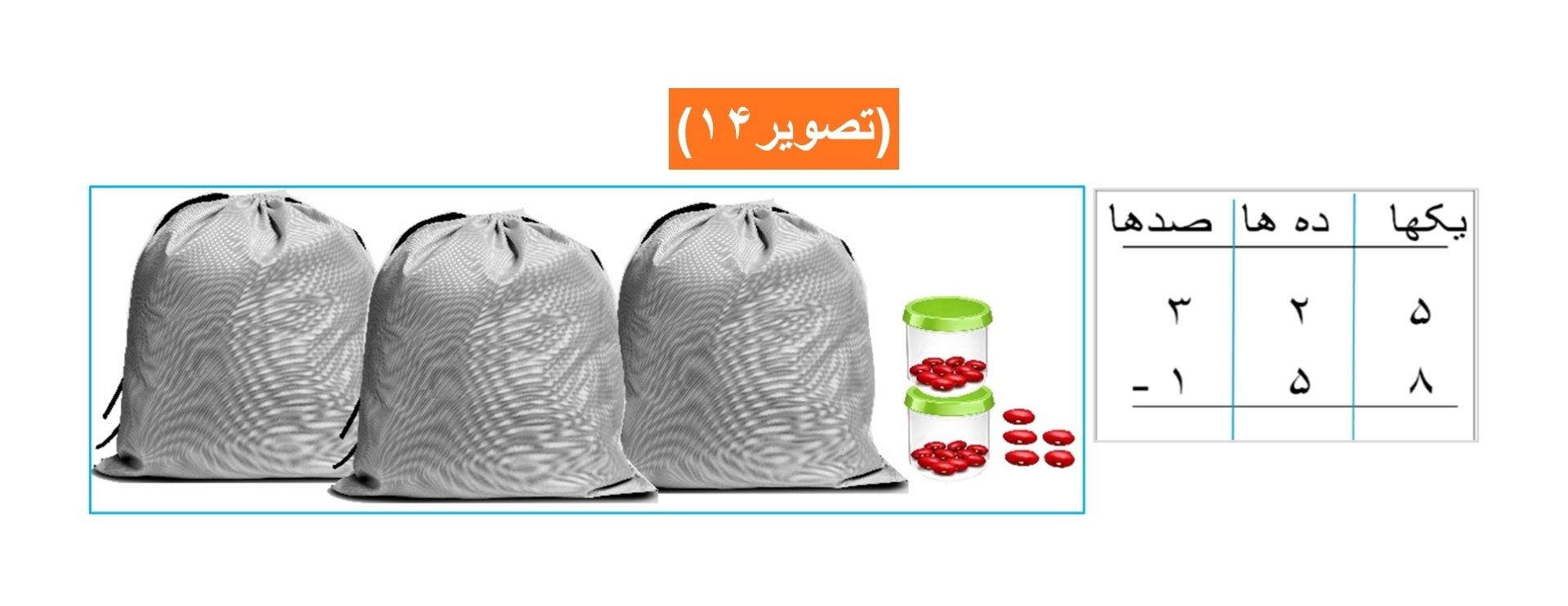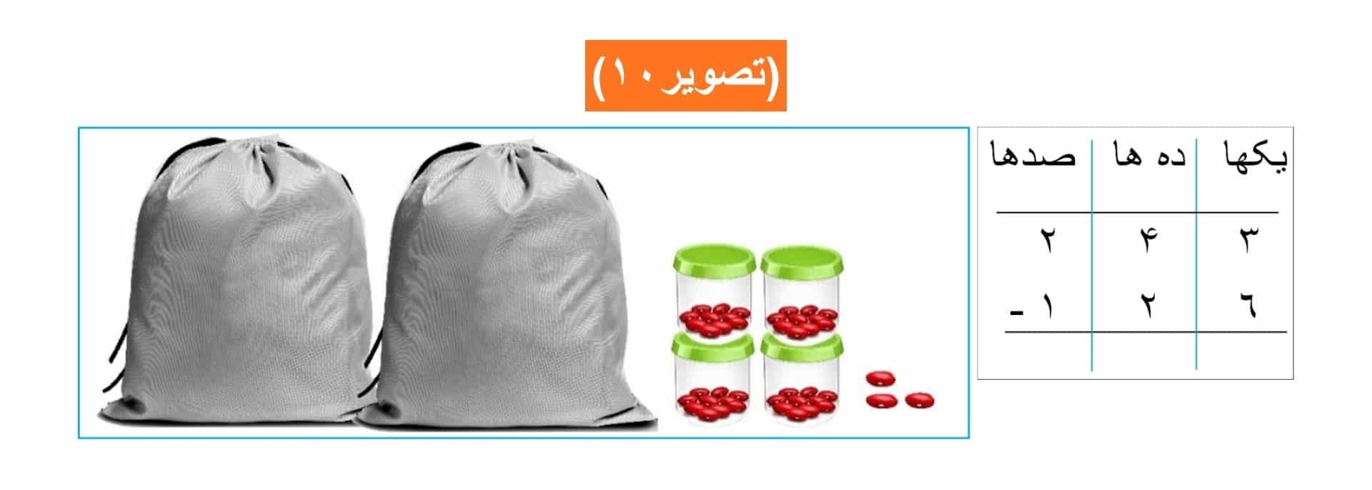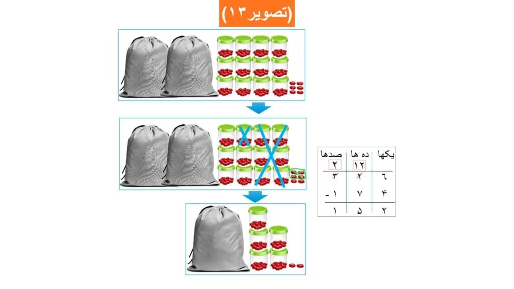 فعالیت دوم: برای تفریق نمودن عدد ١٧۴ از عدد ٣٢٦، ابتدا مانند:(تصویر١٢) عدد ٣٢٦ را با استفاده از دانههای لوبیا، قوطیها و خریطهها تهیه نموده سپس عدد ١٧۴ را از آن تفریق مینماییم.