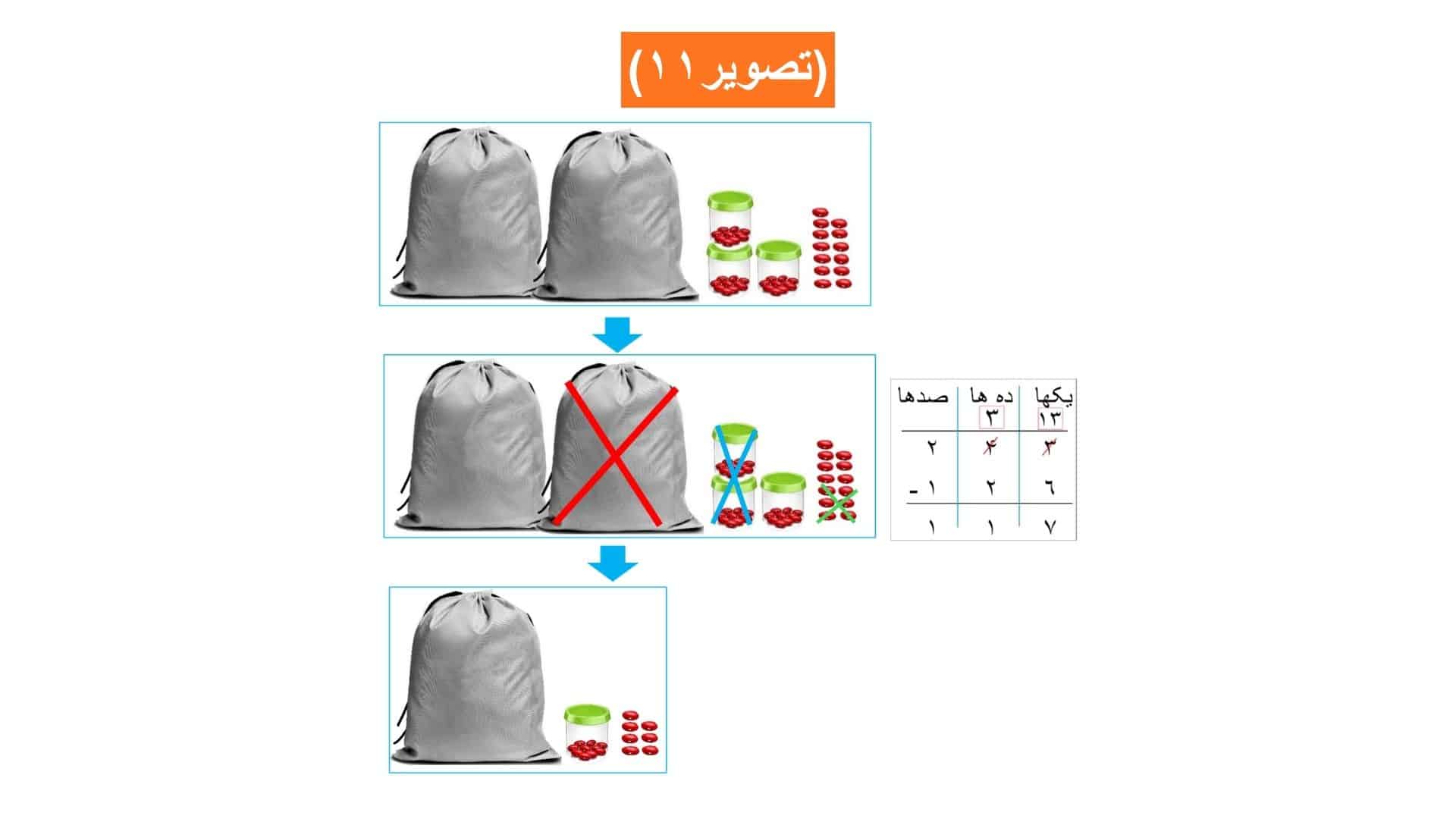 طوریکه به وضاحت دیده میشود، ما نمیتوانیم از ٣ یکها (از٣ لوبیا) ٦ یکها (٦ لوبیا) را کم کنیم، پس باید یک دهها را به یکها تبدیل کرد، بنابراین با تبدیل کردن یک دهها به یکها، ما ١٣یکها، ٣ دهها و ٢ صدها خواهیم داشت. مانند: (تصویر١١) و اکنون با کم کردن ٦ یکها از ١٣ یکها، ٢ دهها از ٣ دهها و ١ صدها از ٢ صدها، ١١٧ باقی میماند.