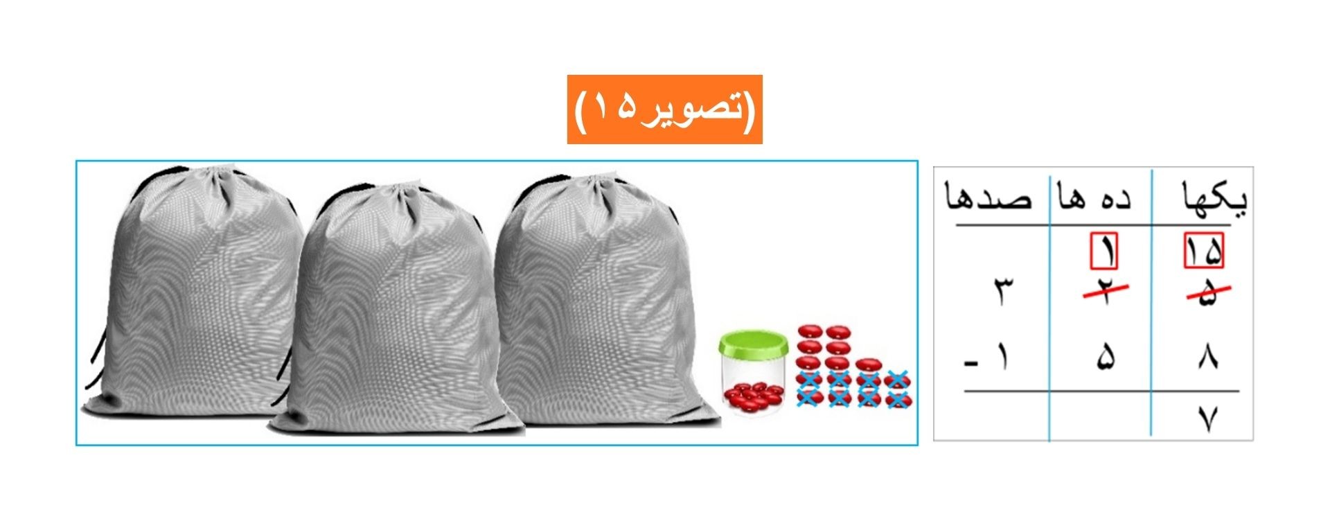 در مرحله اول نظر به (تصویر١۴)، چون از ۵ یکها ٨ یکها را کم کرده نمیتوانیم بناً یک دهها را باز میکنیم که با ۵ یکها، میشود ١۵ یکها مانند: (تصویر١۵)، و اکنون از ١۵ یکها ٨ یکها را کم میکنیم که ٧ یکها باقی میماند.