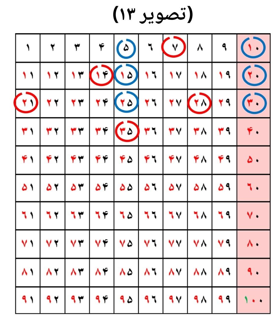 در مرحله دوم از شاگرد چهارمی خواسته شود که این کار را برای تا ۷ تا انجام دهد.یعنی: ۱۰۰، ۱۴، ۲۱ الی عدد ۳۵ و شاگرد پنجمی از ۴۲ الی ۶۳ و شاگرد بعدی از عدد ۷۰ به بعد این فعالیت را ادامه دهد.مانند:(تصویر ۱۳).