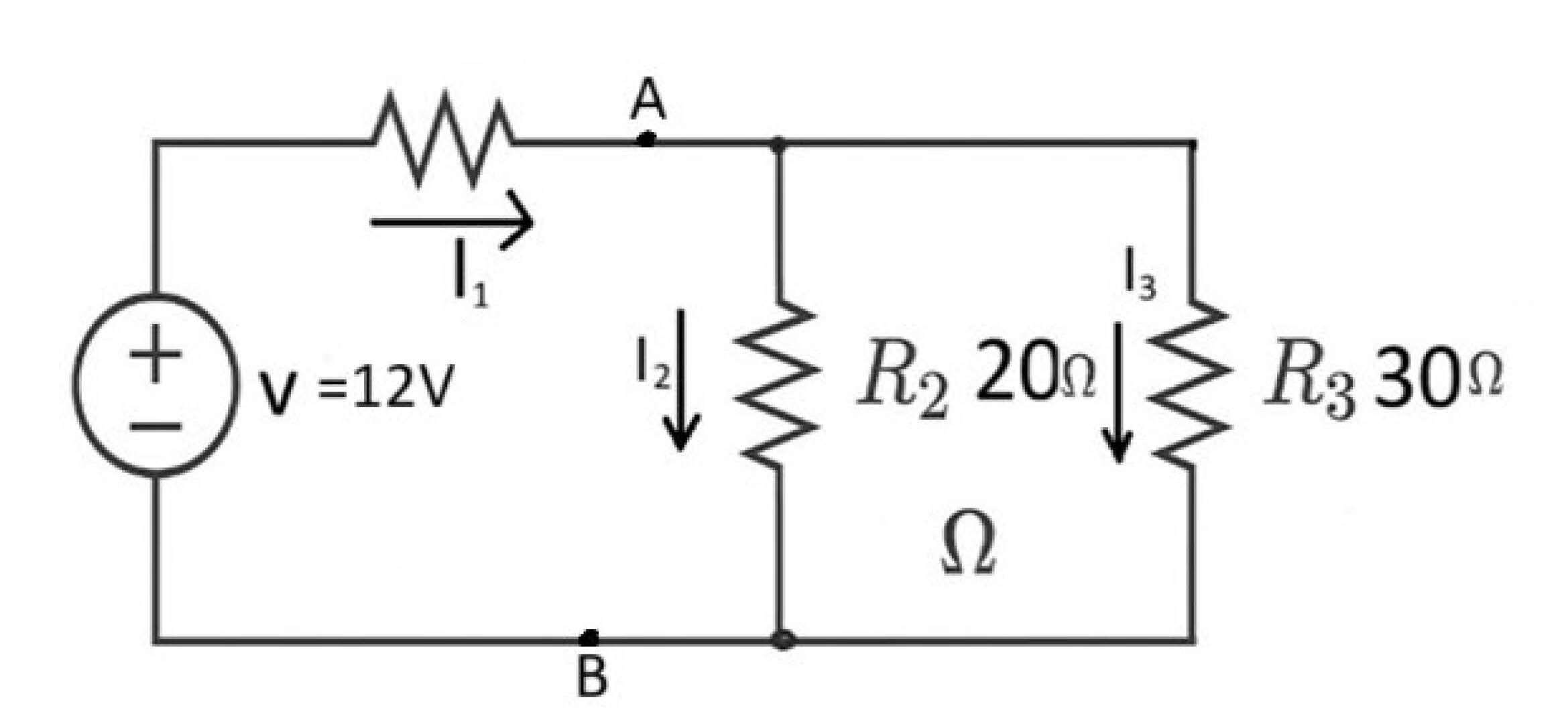 د کرشهوف له لومړۍ معادلې څخه لرو چې: I1 = I2 + I3