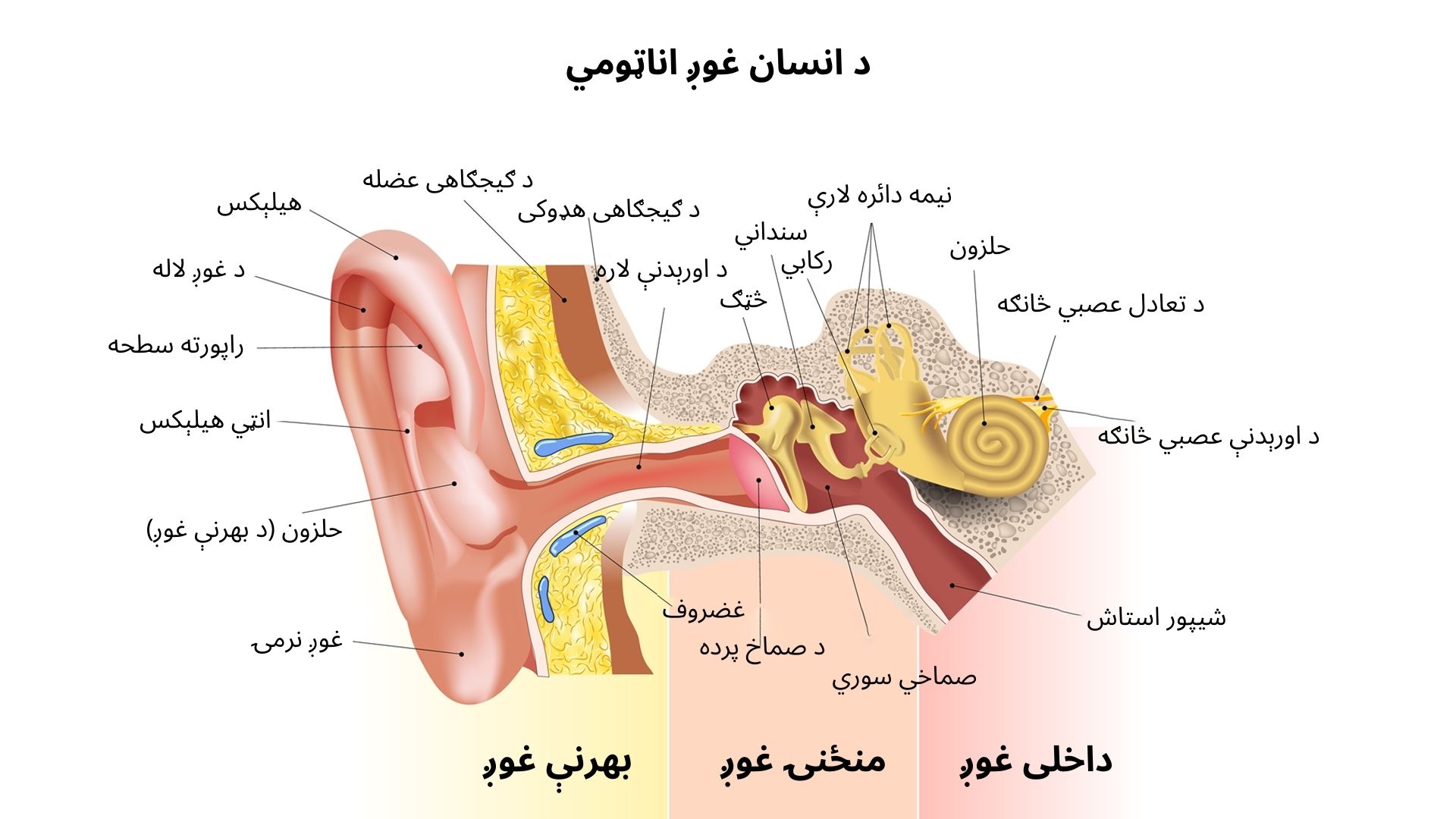 د غوږ هغه برخې چې زموږ د اوریدو حس سبب کیږي په درېیو برخو وېشل شوې دي چې عبارت دي له: