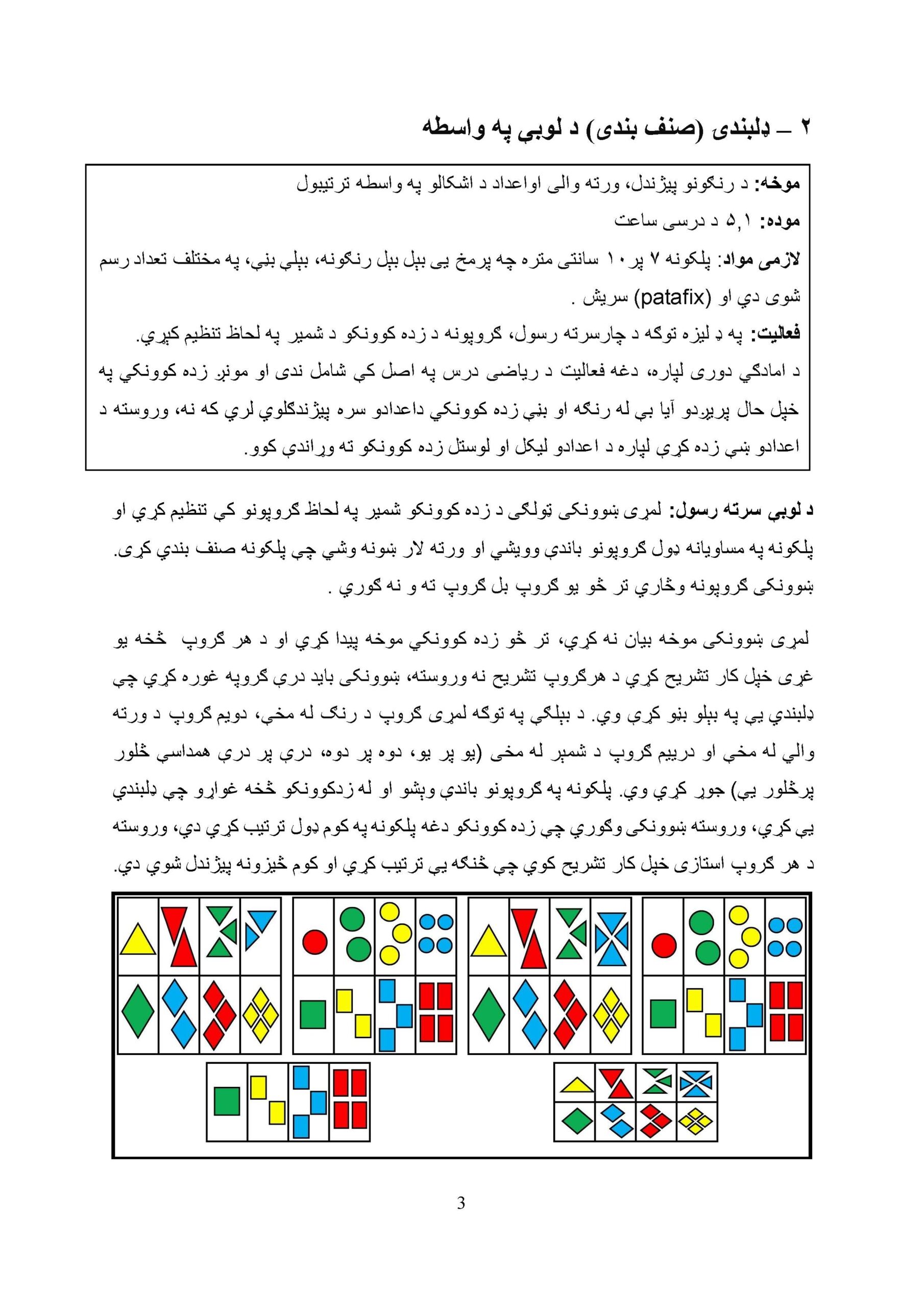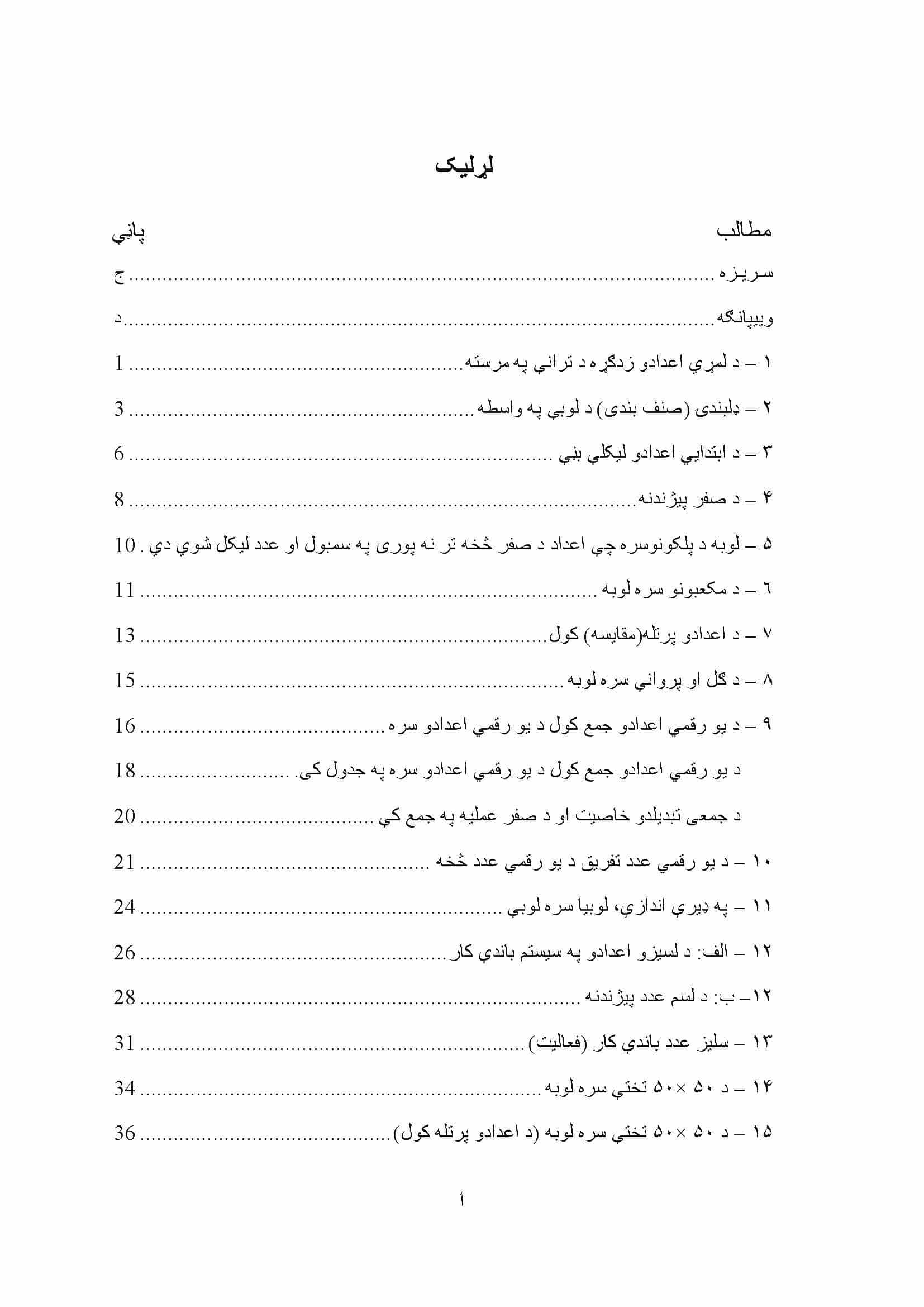د لومړي ټولګي د ریاضي لارښود کتاب ستاسو چوپړ ته وړاندې کیږي. په دې کتاب کې مو هڅه کړې چې د لومړي ټولګي د ریاضي موضوعات دښوونېزو لوبو او درسي موادو په مرسته په بېلابېلو مېتودونو او لارو چارو بیان کړو. د درسي موادو سره د کار کولو موخه دا ده چې له یوې خوا زده کوونکي درس ته لېواله شي او درس ورته په زړه پورې شي، او له بلې خوا د هرې موضوع مفهوم ښه روښانه شي.