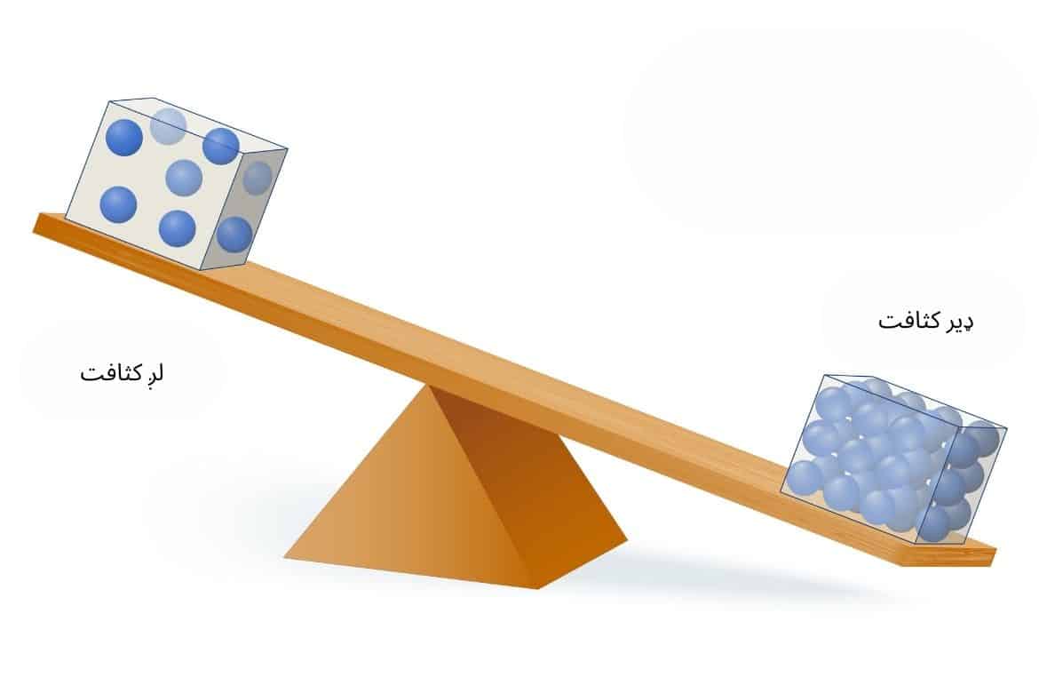 او په هره اندازه چې جوړونکي ذرات کم وي او یو د بل څخه واټن ولري هغه شې کم کثافت لري، سپک وي او کتله او وزن یې کم وي.