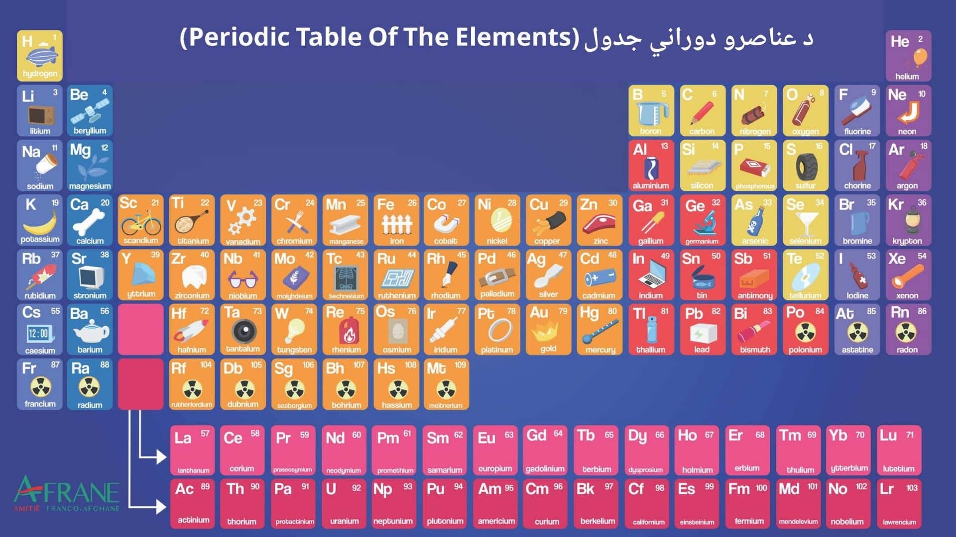 د عناصرو تناوبي جدول د هر عنصر سره تړلي عملي بېلګې (مواد او وسایل) سره. د ډاونلوډ لپاره دلته کلیک وکړئ.