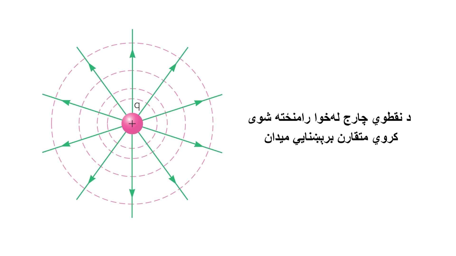 مثبت چارج (+): د برقي ساحې کرښې له مثبت چارج څخه بهر لور ته لوری لري (دافعه).